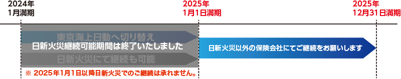 2024年12月をもちまして日新火災の継続契約並びに新規契約のお引き受けを終了させていただきました。