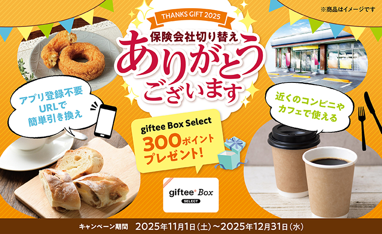<THANKS GIFT 2025>期間中に日新火災より東京海上日動・あいおいニッセイ同和損保・損保ジャパンへ自動車保険のご契約を切り替え手続きいただいた方全員へプレゼント!!